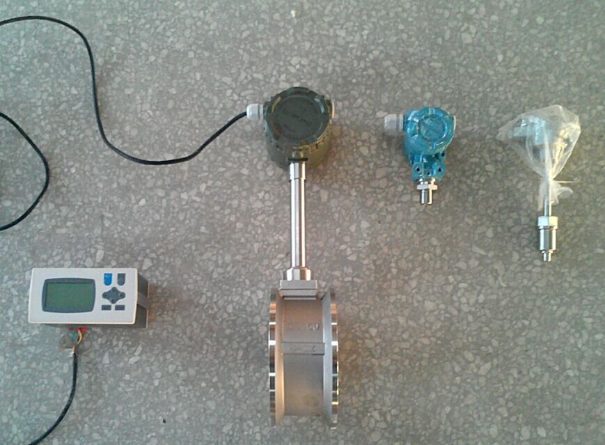 JN-LYWBFP1406补偿分体涡街流量计说明 概述: 涡街流量计是根据卡门涡街理论。卡门涡街释放频率f和流速V成正比,因此通过测量卡门涡街释放频率就可算出瞬时流量。涡街流量传感器的旋涡释放频率是由旋涡交替地作用于检测传感器(探头)上的,应力通过在它内部的压电晶体或差动电容元件来检出的,以此制成的一种速度式流量仪表。 压电式涡街流量计:应力式涡街流量计是速度式流量计的一种,它以卡门涡街理论为基础,采用压电晶体检测,流体通过管道内三角柱时所产生的旋涡频率,从而测量出流体的流量。结构简单,无运动磨损部件,测量平顺,量程宽,阻力损失小。